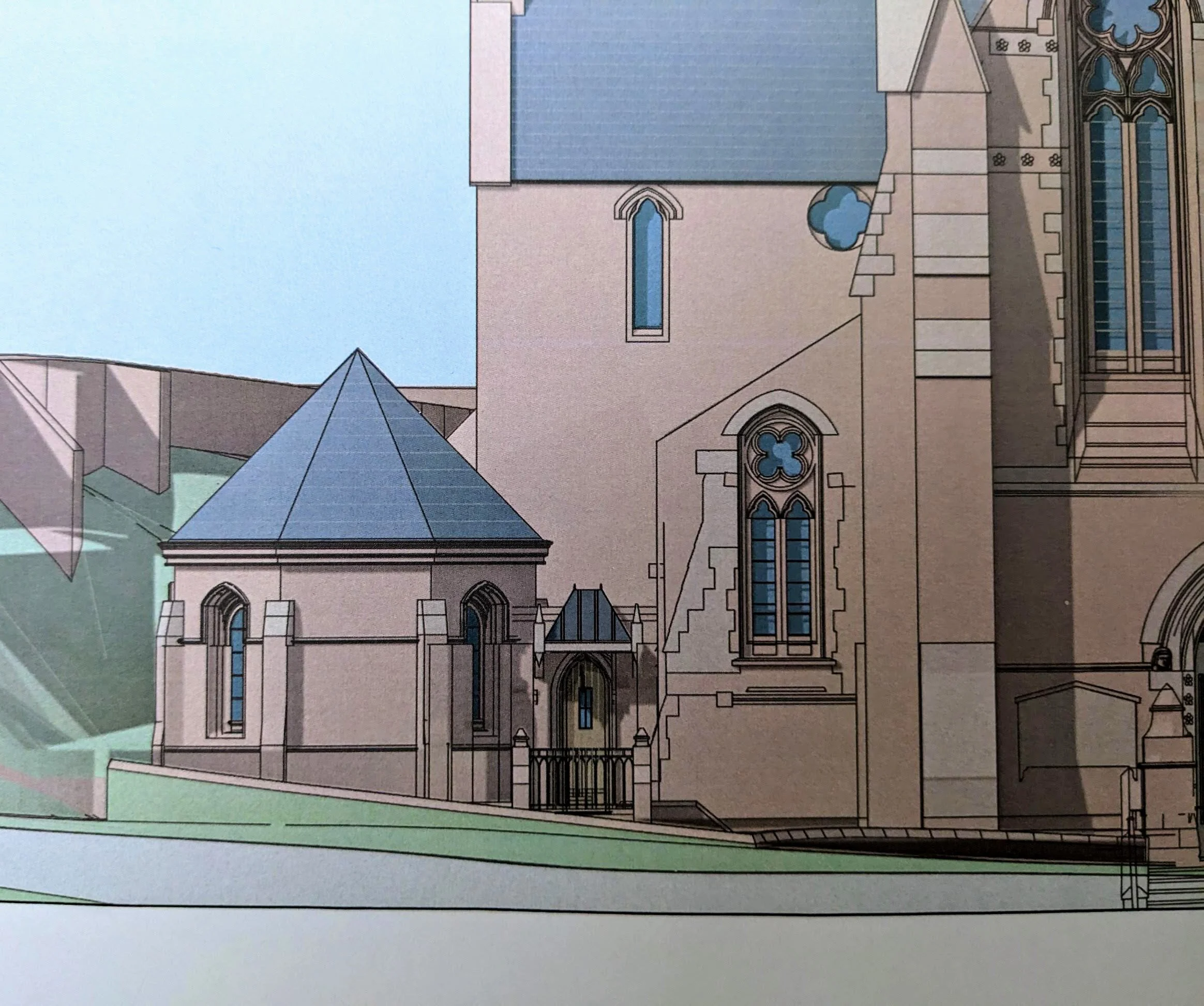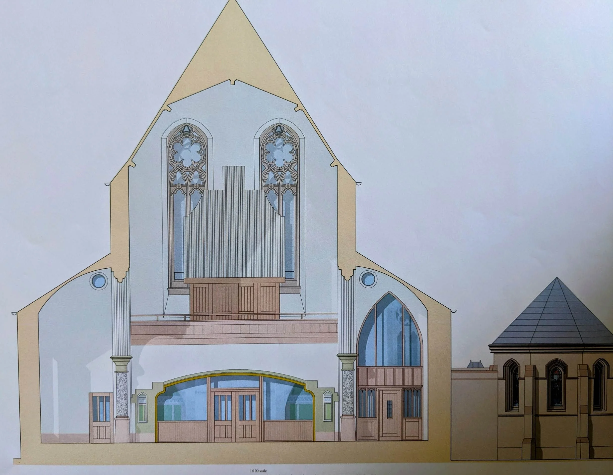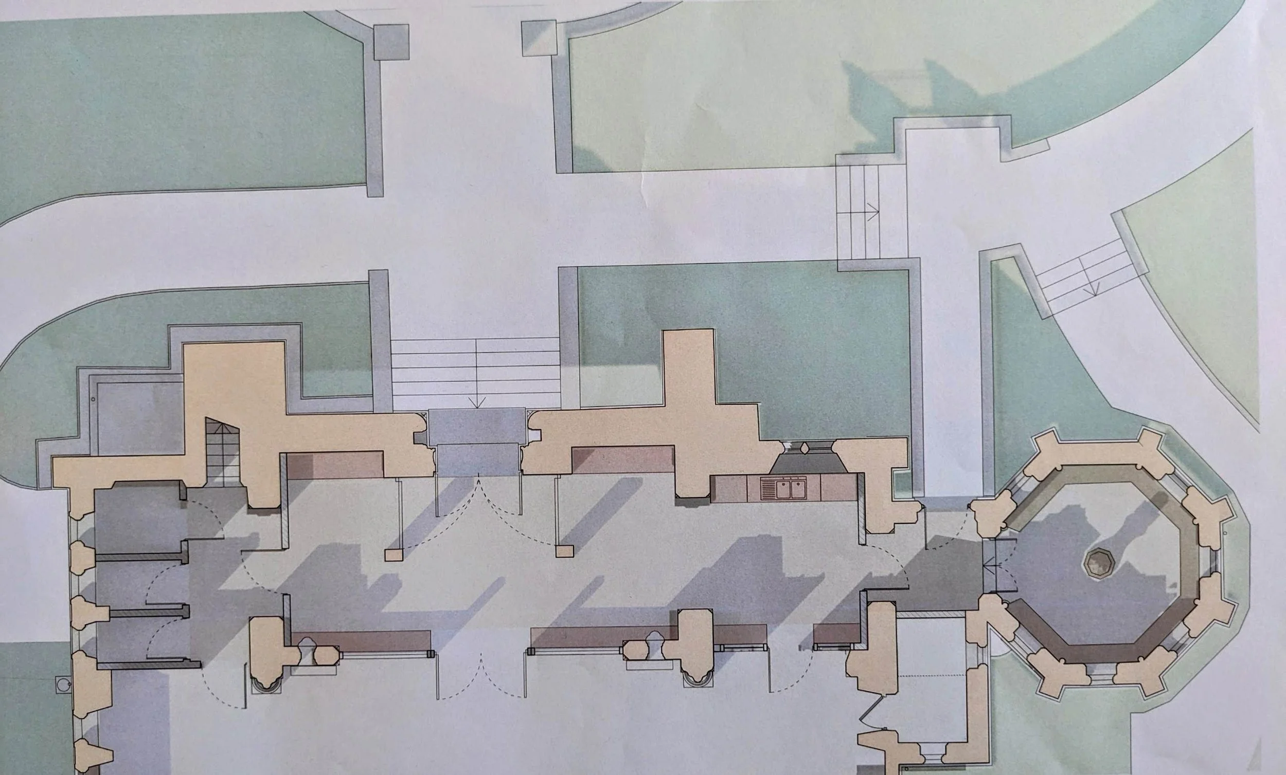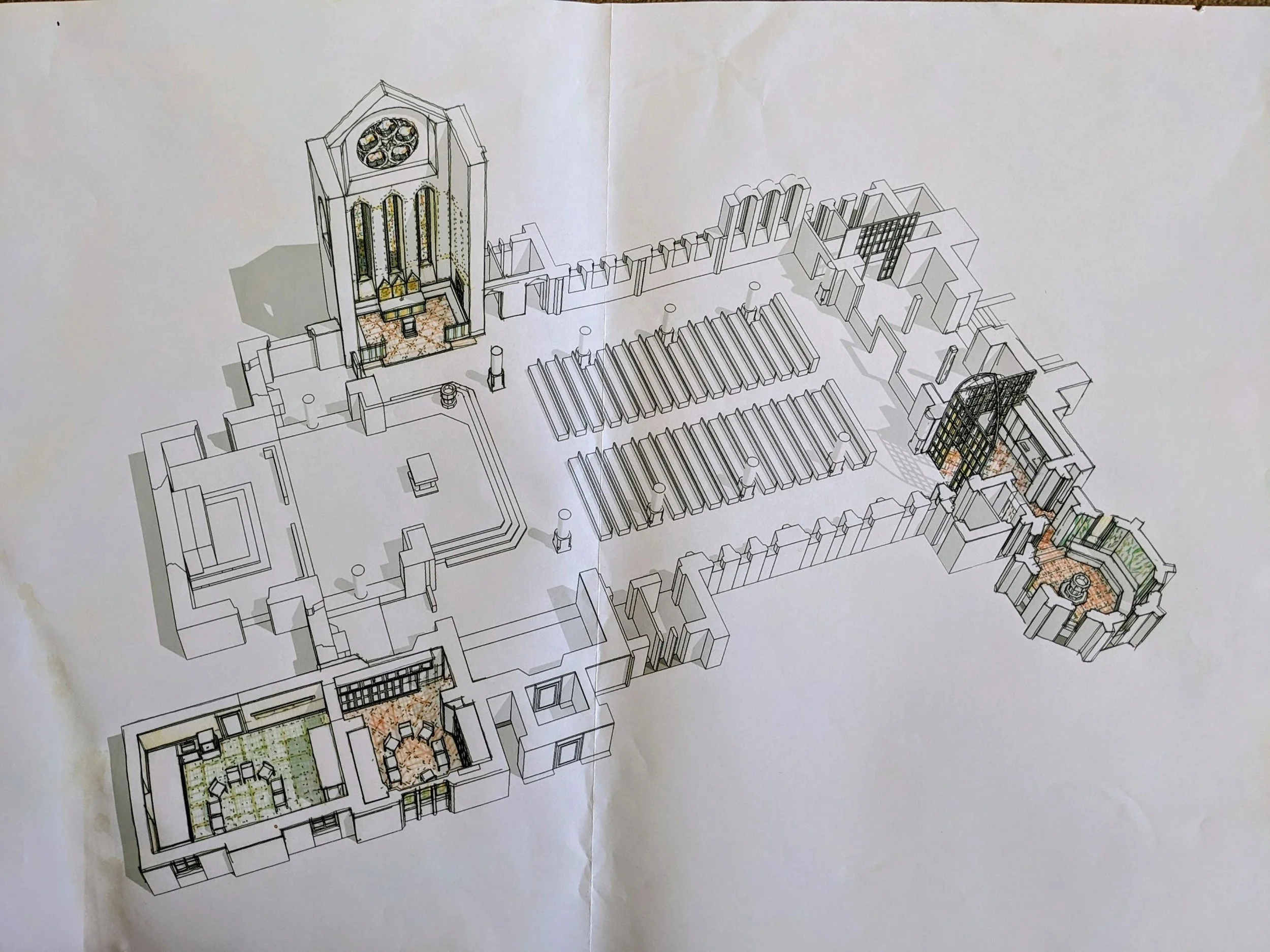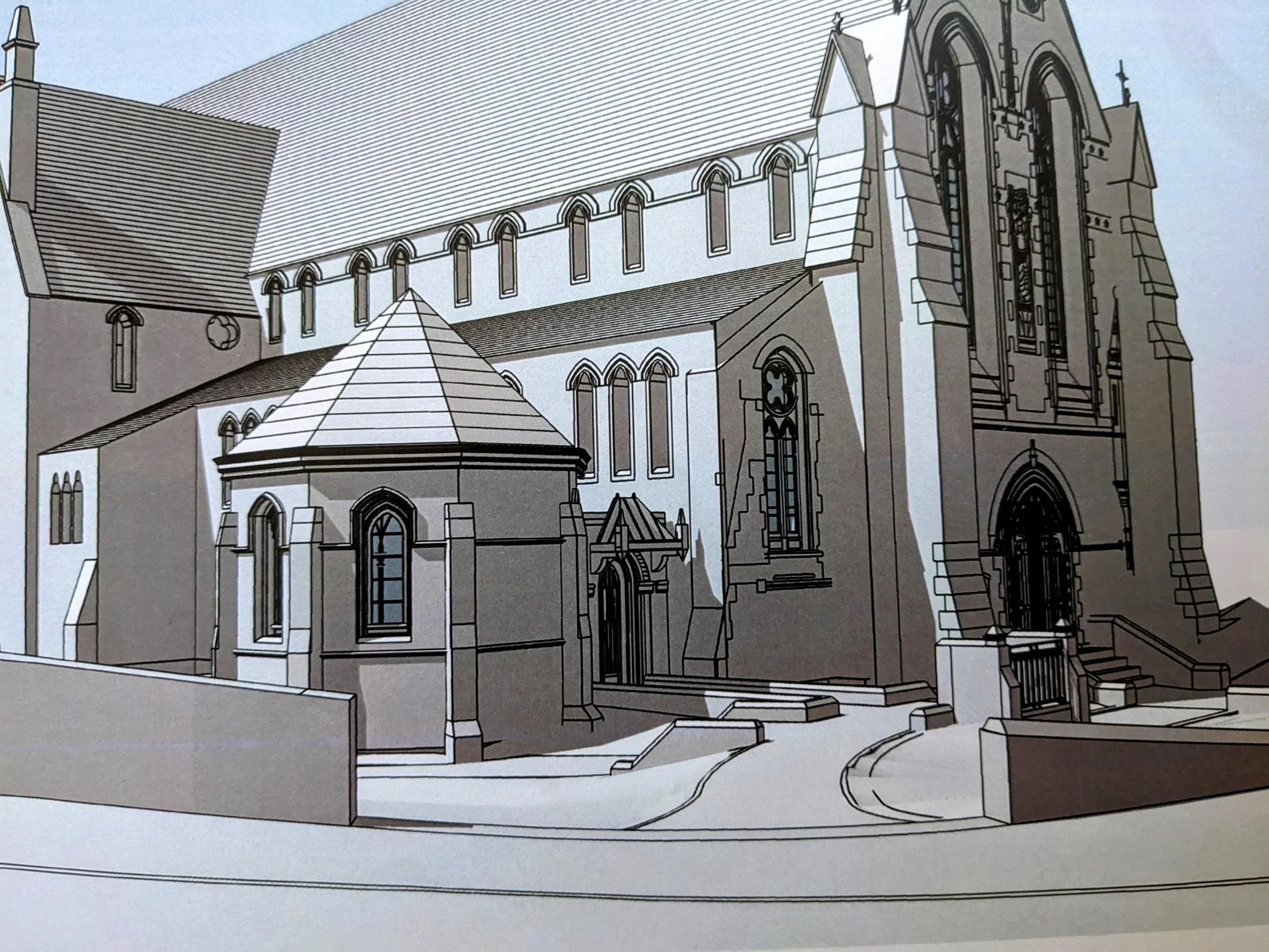To this end, the Stella Maris group was established to coordinate the restoration project of the church and its fundraising efforts. A new architect was appointed, Dominic Roberts, who has identified three areas of development: the re-decoration and restoration of the sacristy; the high-level repair work to the South Transept rose window and its masonry; and, the re-imagining of the narthex (or porch) area. This latter project would involve the creation of a new level entrance at the point between the baptistry and the piety store end of the narthex, semi-enclosing the existing narthex area as a meeting room, and the provision of toilets and simple kitchen facilities. This project has the advantage of respecting the integrity of the building whilst enhancing its usage and creating an environment which is welcoming and hospitable and builds up community.